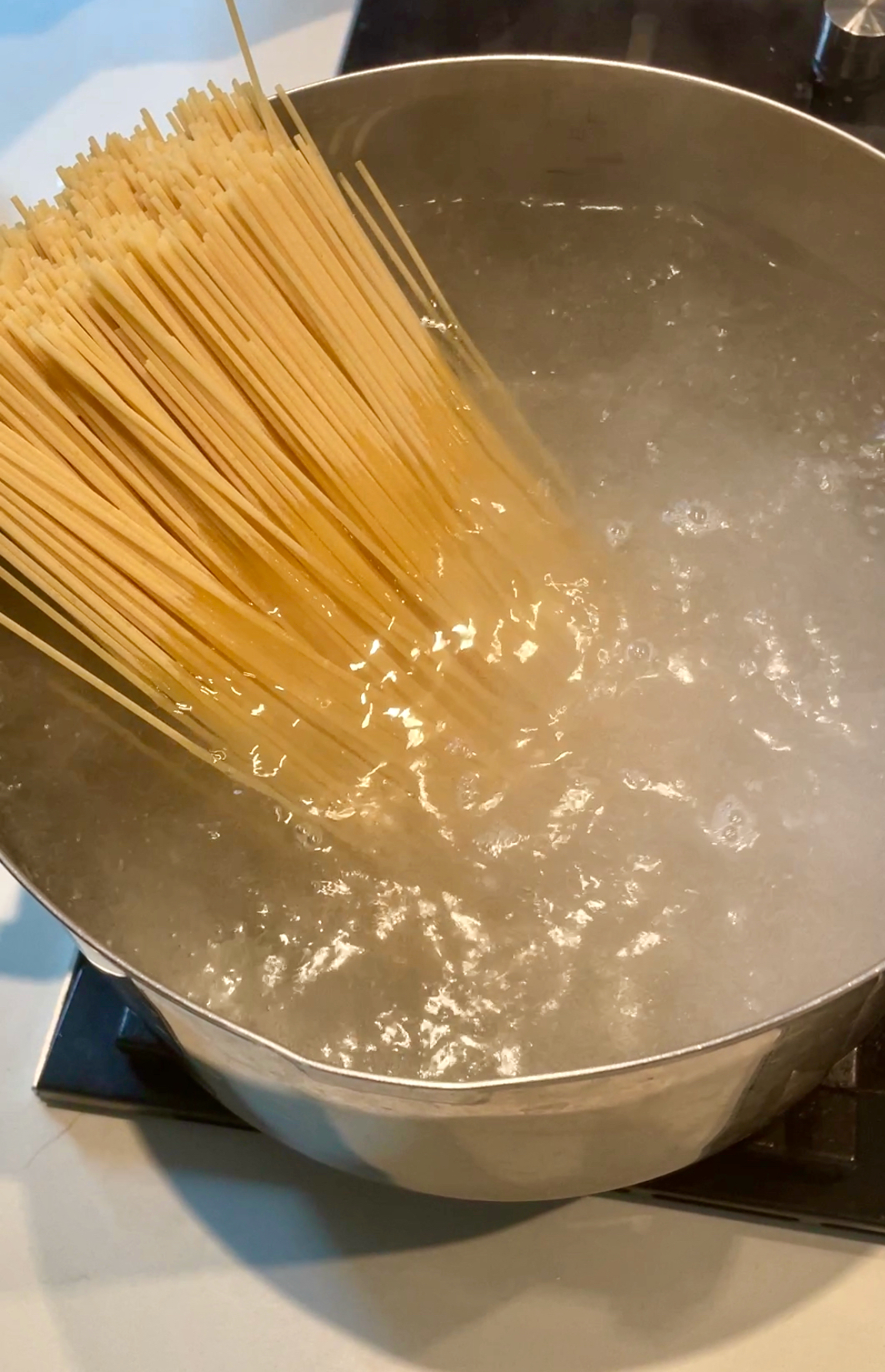 Faites cuire les spaghettis « al dente » dans un grande quantité d’eau bouillante préalablement salée.